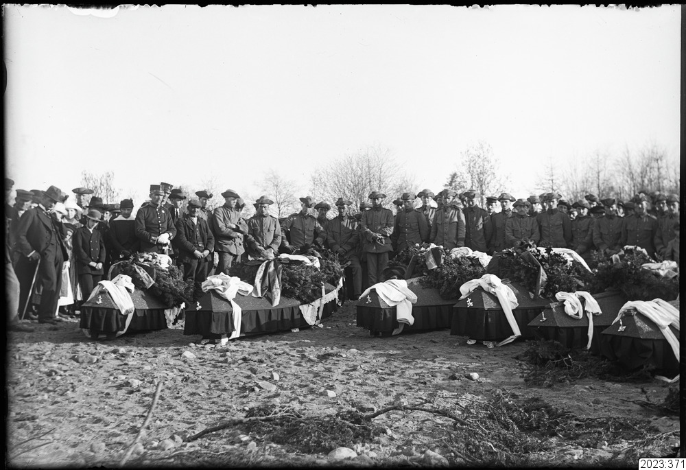 Invalidbegravning på Haparanda kyrkogård. Svenska landstormsmän paraderar. Tid: 1914-1918.
