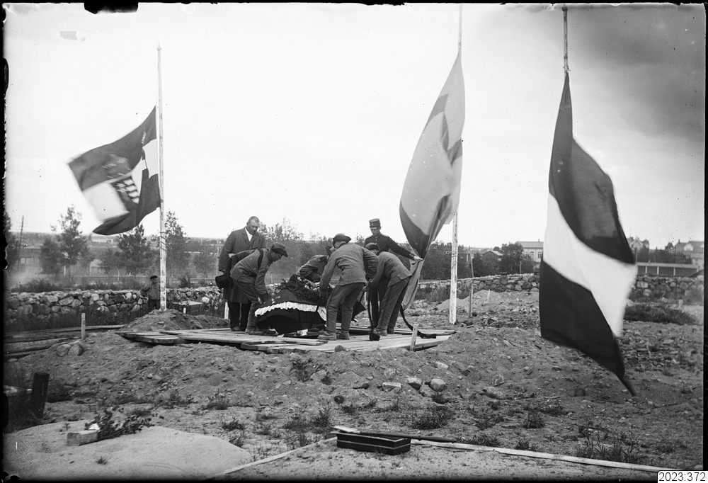 Invalidbegravning på Haparanda kyrkogård. Kista hissas ner i gravhålet av fyra stycken landstormsmän. Tid: 1914-1918.