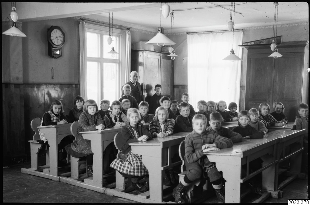 Interiörbild från folkskolan. Barn sittande bakom sina bänkar i klassrummet. Läraren stående längst bak. Tid: 1930-tal.