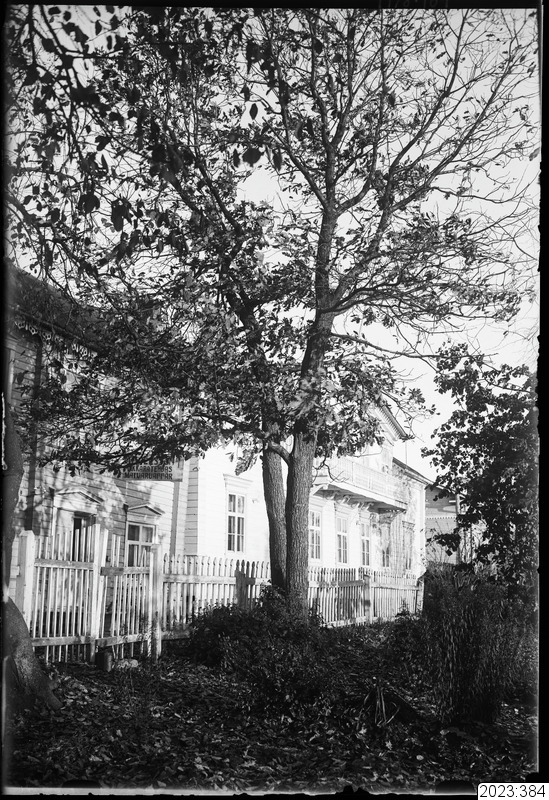 Affärshus. Exteriörbild mot gårdssidan. Ovanför port - skylt där det står "...KKARATEIHDAS MATVARUAFFÄR" (delvis dold text). Tid: 1920-tal.