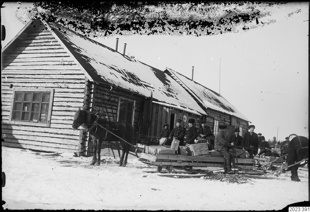 Transitgods skall fraktas iväg med häst och släde. "Postförarna" sitter redo att ge sig av med godset. Tid: 1914-1918.
