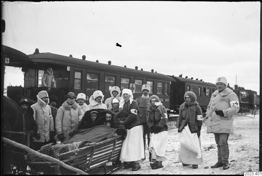 Personal från Röda Korset stående omkring släde vari det ligger 2 stycken krigsskadade som nyss anlänt med tåg till Haparanda. Tid: 1914-1918.