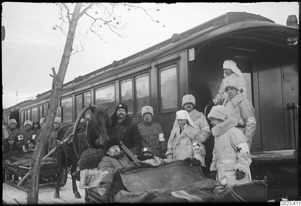 Personal från Röda korset hämtar krigsskadade från tåget. De skadade ligger nerbäddade i slädar. Tid: 1914-1918.