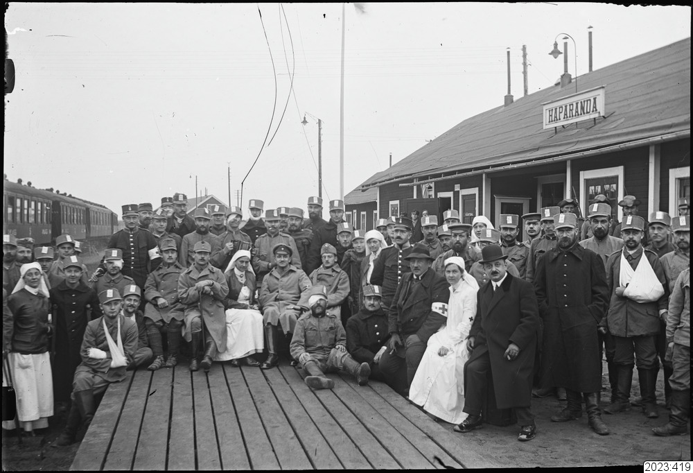 Järnvägsstationen. Krigsinvalider och personal från Röda korset sittande, stående vid och på perrongen. Tid: 1914-1918.