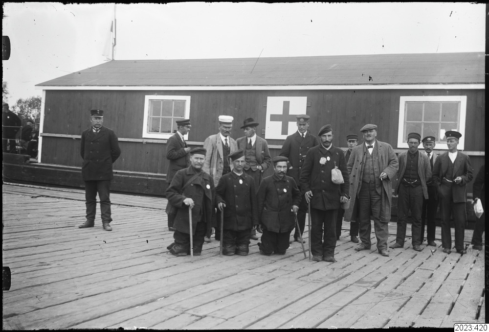 Tre stycken krigsinvalider med stympade ben vid hamnen. Pråm från Röda korset i bakgrunden. Mannen till höger om de ryska invaliderna är konsul S. Unander. Unander omkom i en flygolycka på Torneälvens is i april 1921. Tid: 1914-1918.