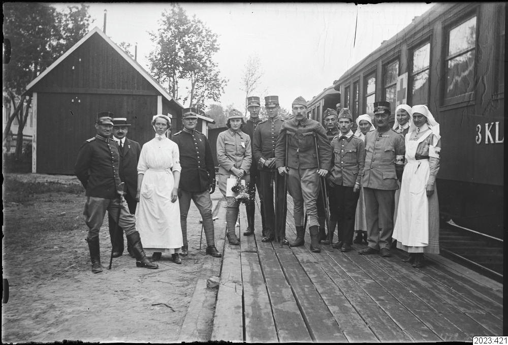 Järnvägsstationen. Röda kors-syster stående på