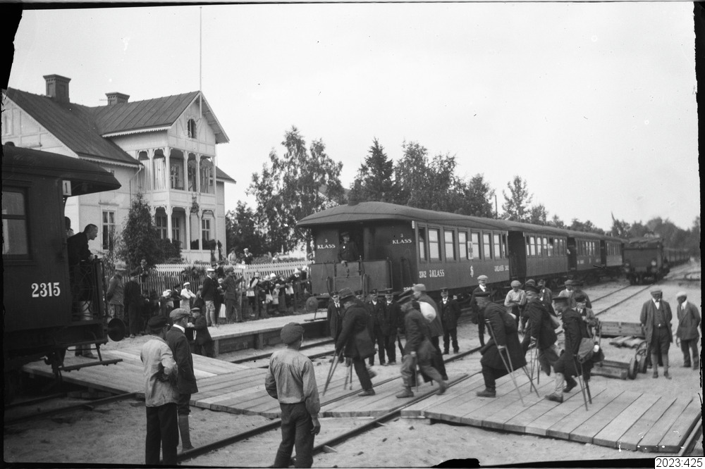 Krigsinvalider anlänt Haparanda station. Gående på kryckor över spårområde vid Piponska gården. Tid: 1914-1918.
