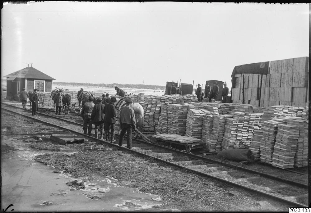 Tenntackor på hamnspåret. Transporter sker med häst och släde. Tid: 1914-1918.