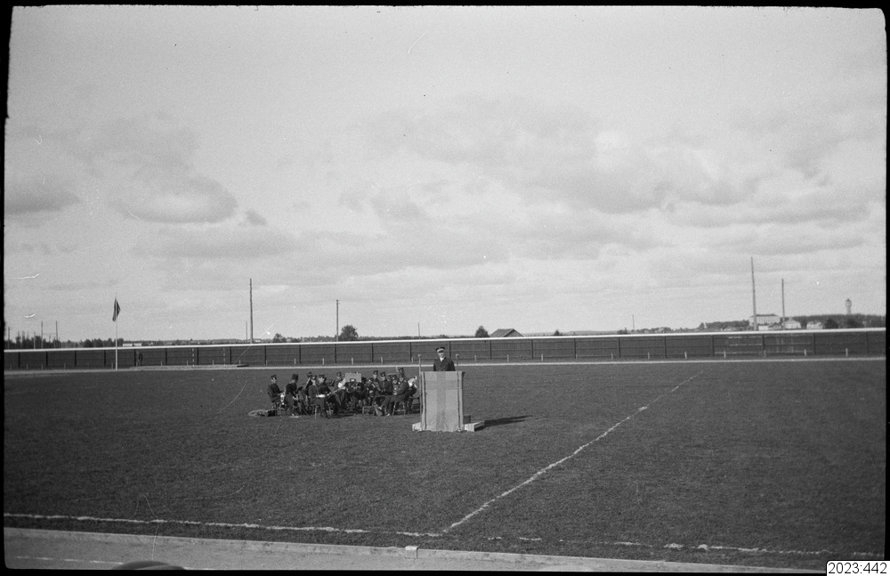 Prisutdelningscermöni på idrottsplan. Man på väg fram till prisutdelaren - musikkår. Man i talarstol. Tid: slutet 1930-tal.