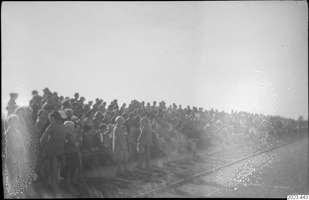 Åskådare på idrottsplan. Tid: slutet 1930-tal.