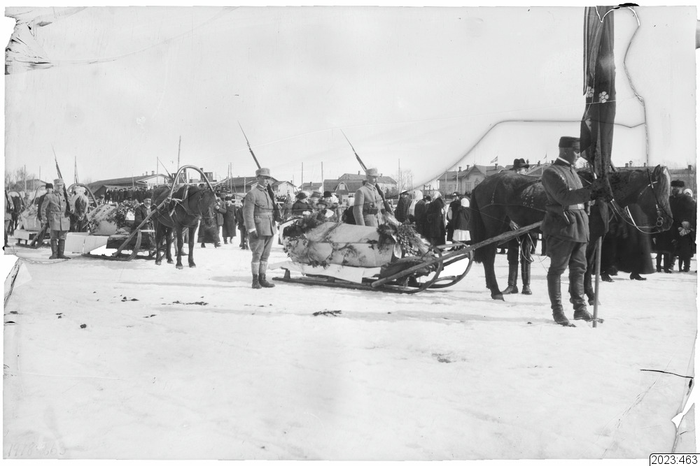 Begravningsfölje. Kistor drages med häst och släde. Fanbärare går först. Tid: 1914-1918.