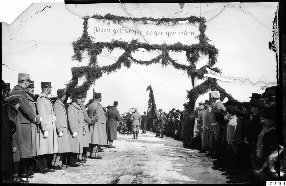 Begravningsprocession går under granrisklädd "båge" på vilken det står "Döden ger seger, seger ger döden". Tid: 1914-1918.