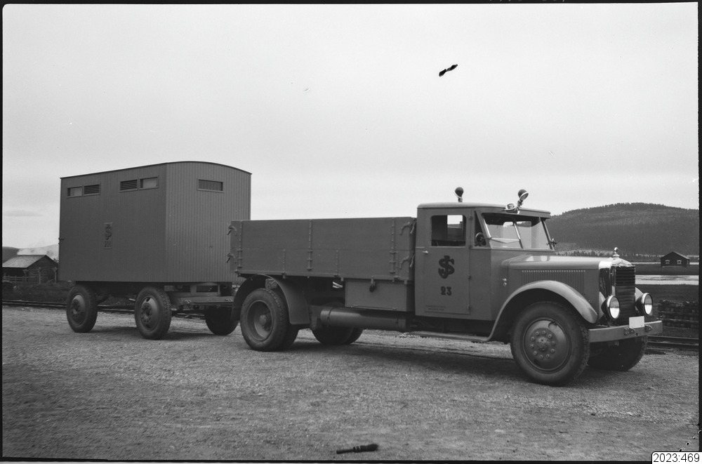SJ:s lastbil nr: 23 med släpvagn. Tid: 1930-tal.