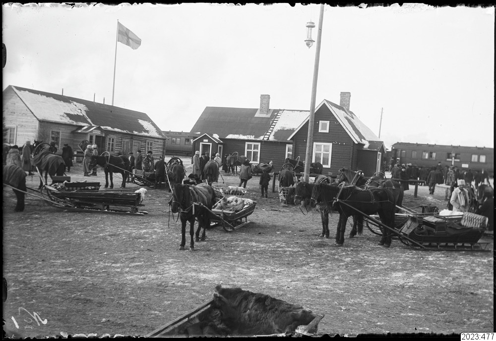 Järnvägsstationen. Hästskjutsar stående på den stora öppna planen framför stationsbyggnaden i väntan på transporter från det inkommande tåget. Tid: 1914-1918.