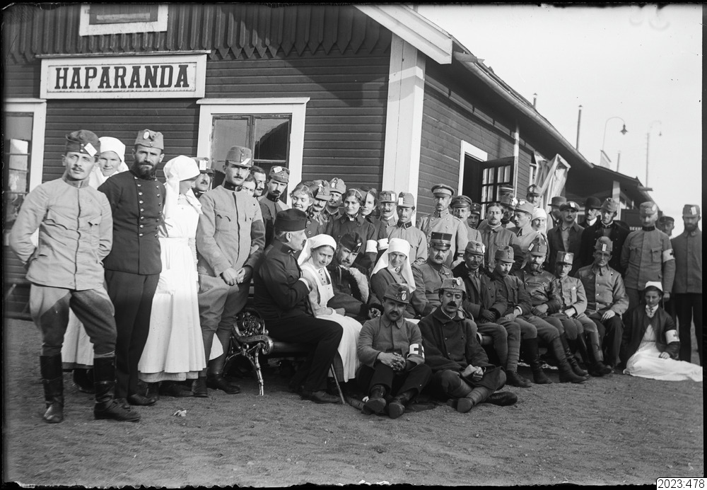 Gamla järnvägsstationen. Personal från Röda korset och krigsskadade militärer stående och sittande framför gamla stationsbyggnaden. Tid: 1914-1918.