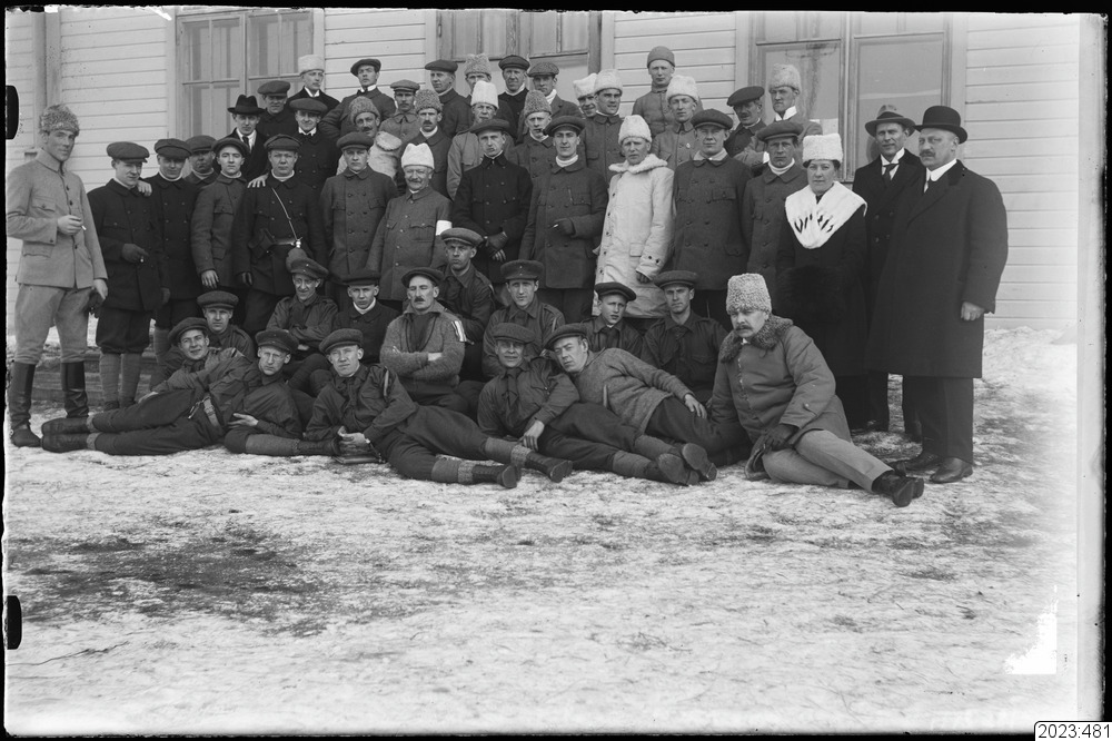 Gruppbild - förmodligen anställda vid SJ eller Posten stående framför gamla järnvägsstationen. Tid: 1914-1918.