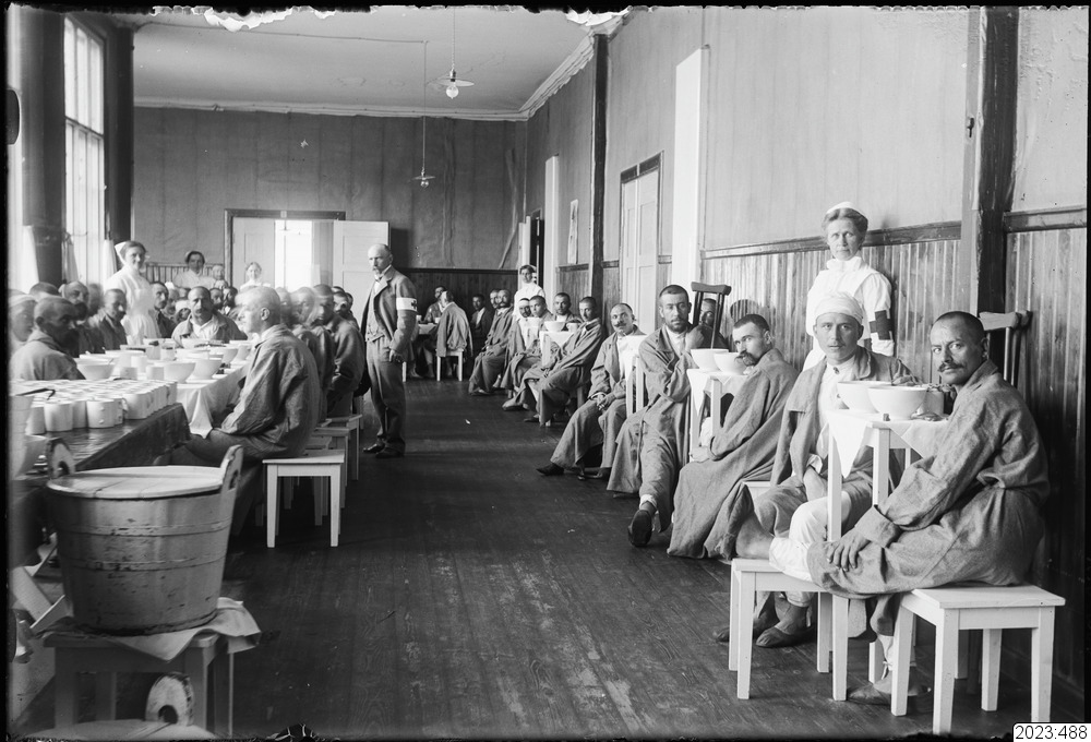 på förläggningen. Interiörbild - Sitter i matsalen och äter. Tid: 1914-1918.