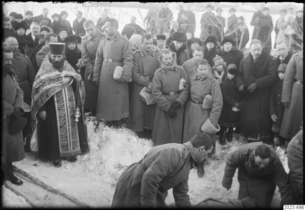 Begravningsprocession, Ortodox, Den ortodoxe, rökelsebärande prästen är centralmotivet. Tid: 1914-1918.