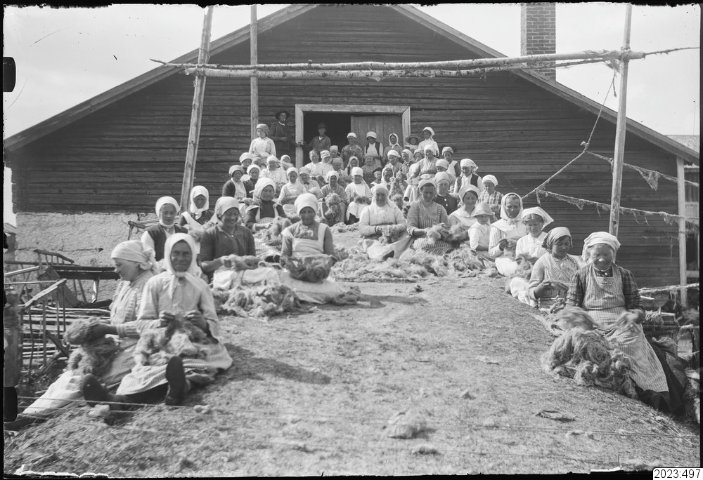 Kvinnor i arbete med lintorkning. Linet skulle vidarexeporteras från Ryssland till England. Tid: 1914-1918.