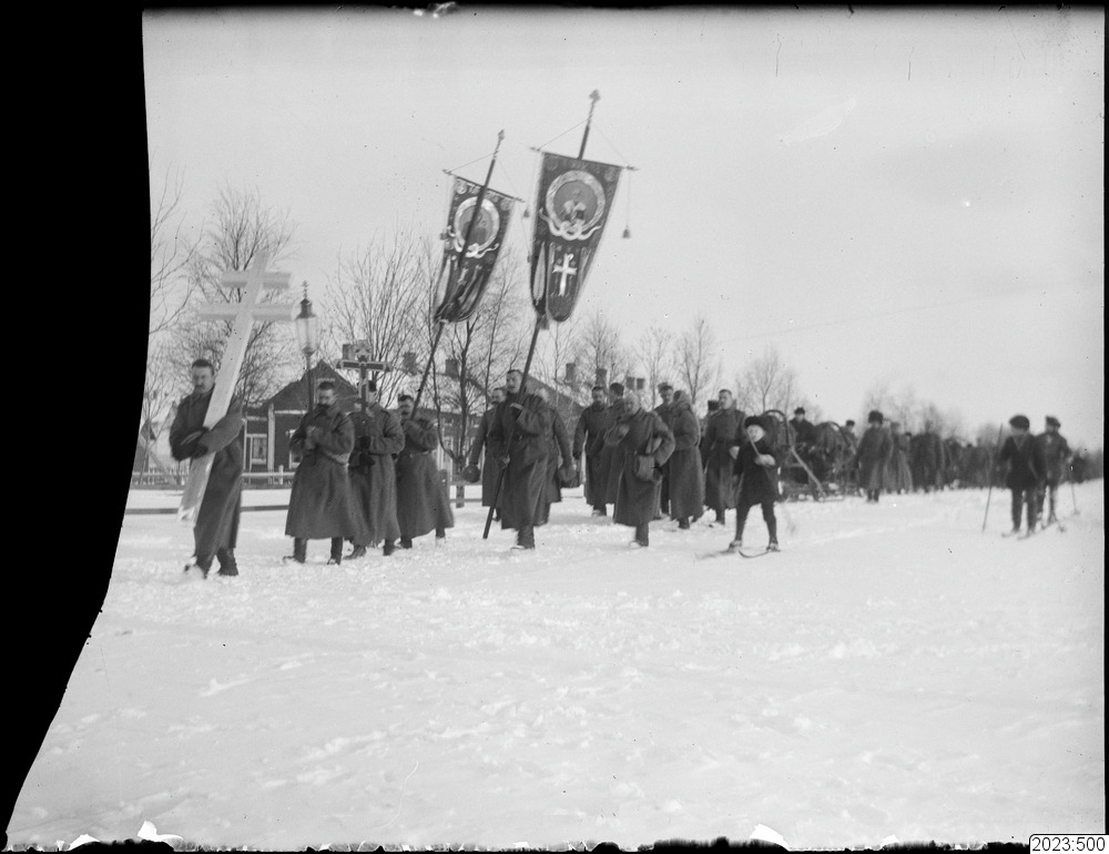Rysk invalidbegravning, procession. Soldat bärande ett andreaskors i trä, därefter följer 2 stycken helgonstandar. Tid: 1914-1918.