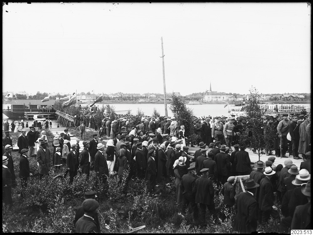 Gångvägen upp från Röda korsets pråm smyckad med ungbjörk. Militärmusikkåren spelar. Tid: 1914-1918.