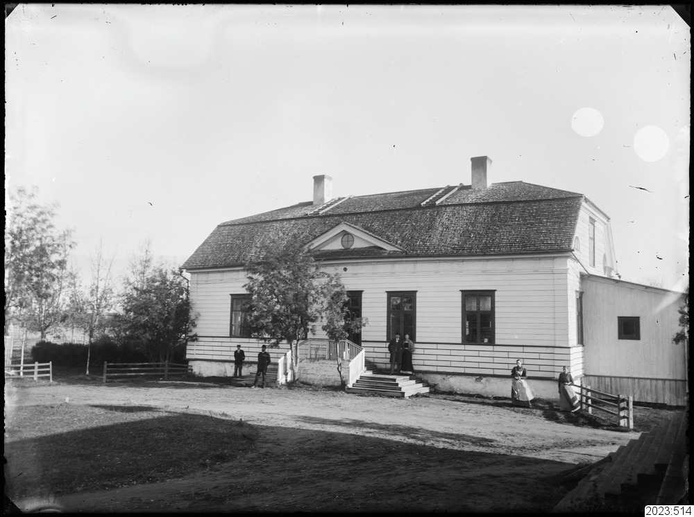 Kopukka herrgård. Extriörbild. Stor träbyggnad med brutet tak. I rät vinkel skymtar annat hus. Husen bildar