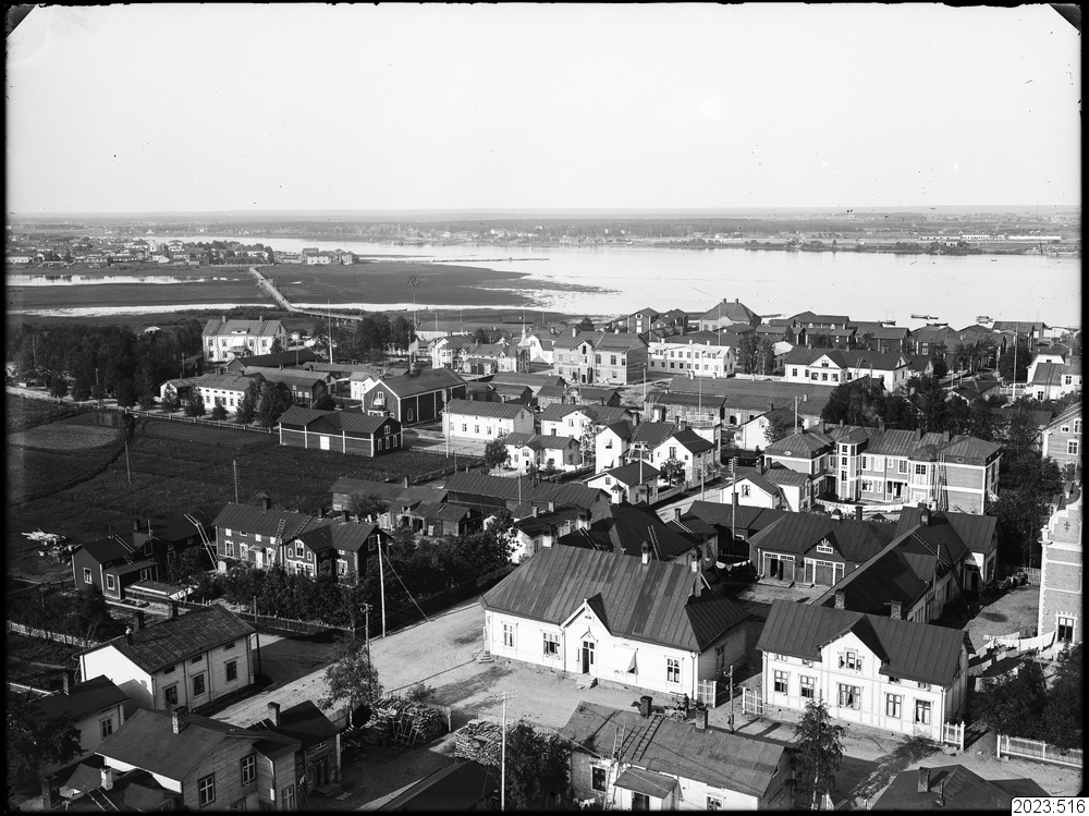 Torneåälvens mynning - Den första snön har fallit. Bilden tagen från vattentornet i Haparanda mot Torneå och finska fastlandet. Tid: 1915-1925.