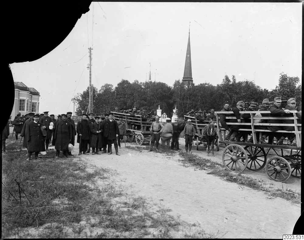 Rysk invalidtransport. Torneå kyrka i bakgrunden. Tid: 1914-1918.