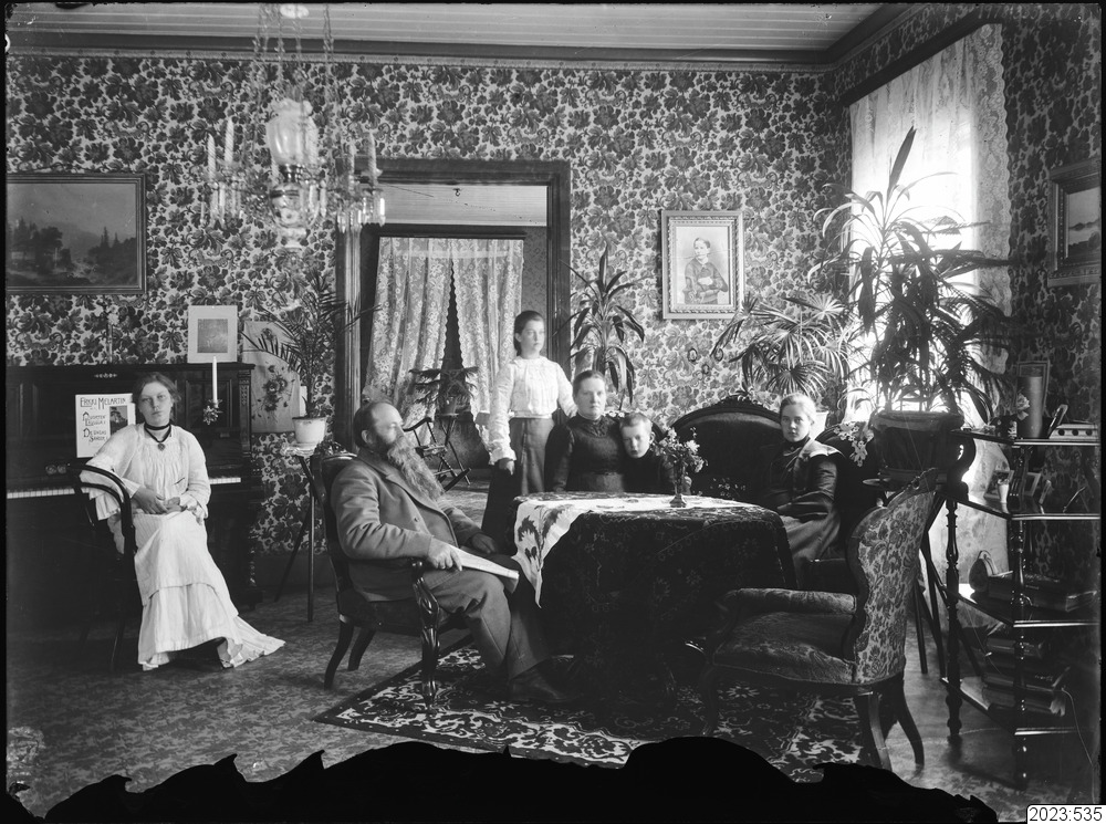 Interiörbild - borgerligt hem. Familjen samlad i salongen. Tid: 1915-1925.