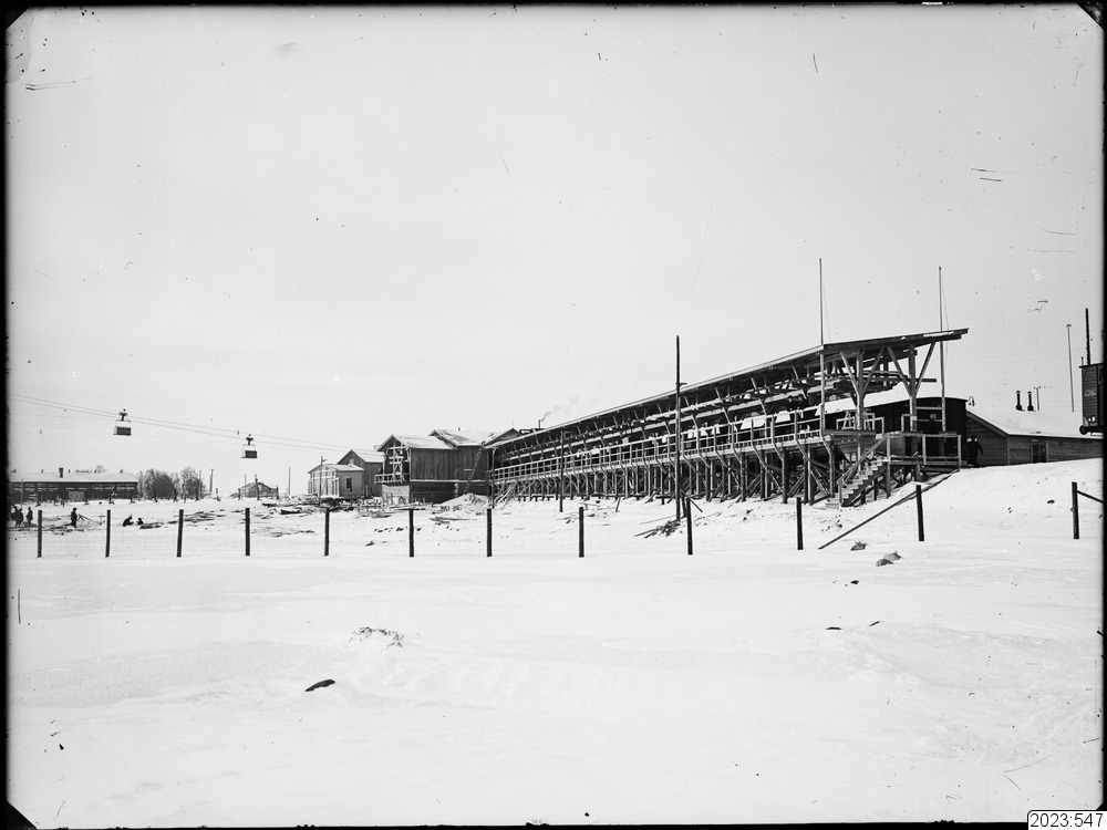 Linbanefästet vid ena stranden. Hamnbrygga och spårområde till höger. Tid: 1917-1918.