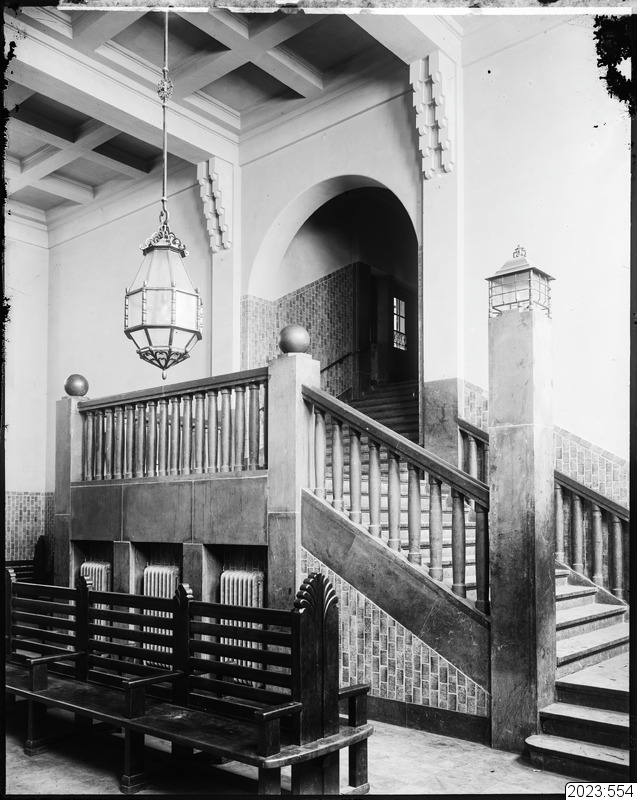 Järnvägsstationen. Interiörbild. Bilden tagen från den stora hallen upp mot trappuppgång. Tid: 1920-tal.