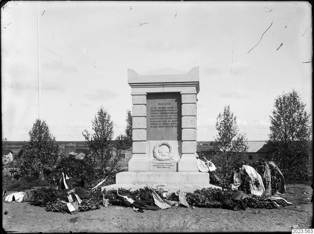 Invalidmonumentet på Haparanda kyrkogård. Kransar lagda kring monumentet. Tid: 1919.
