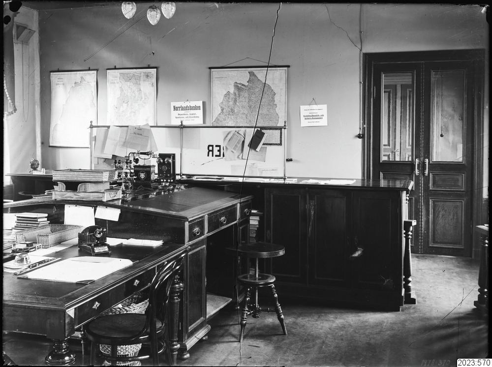 Norrlandsbanken. Interiörbild. Skrivbord med "rikstelefon". Tid: 1920-tal.
