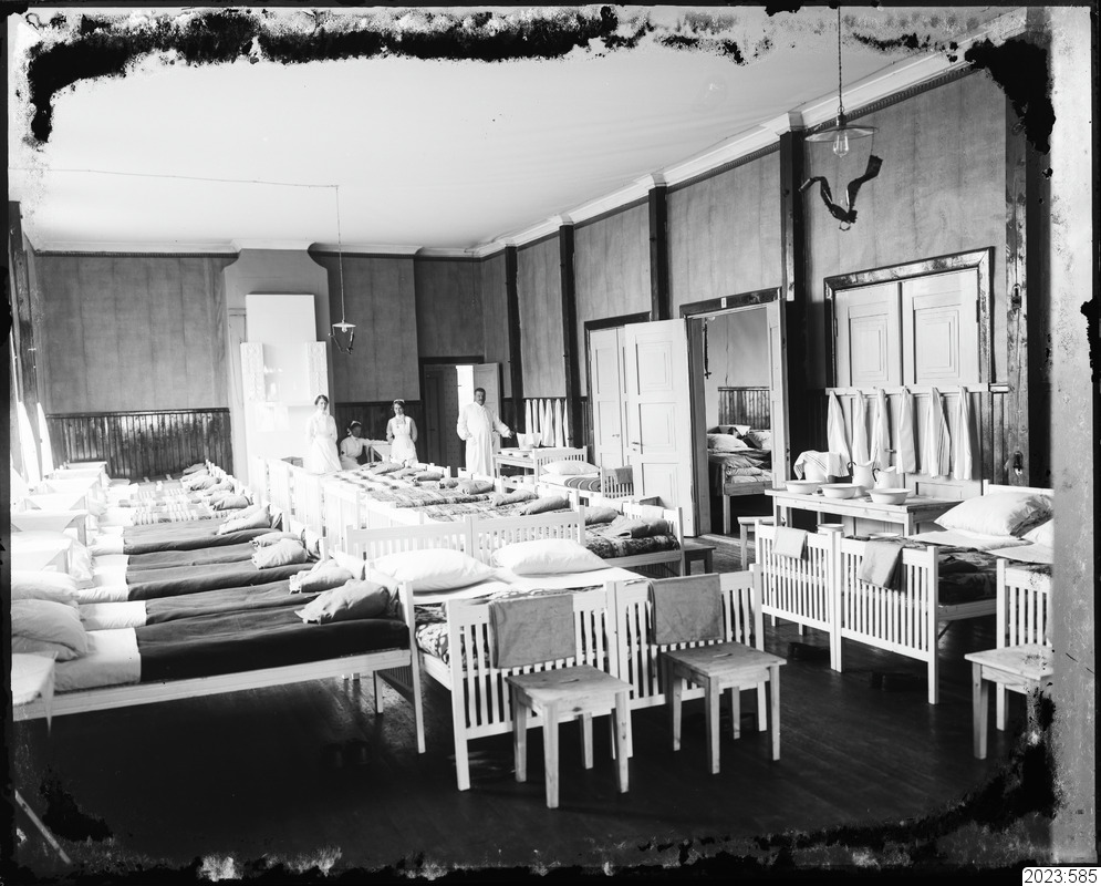 Röda korsets sjukhusförläggning. Interiörbild, sjuksal med tomma sängar och personal från Röda korset i fonden. Tid: 1914-1918.