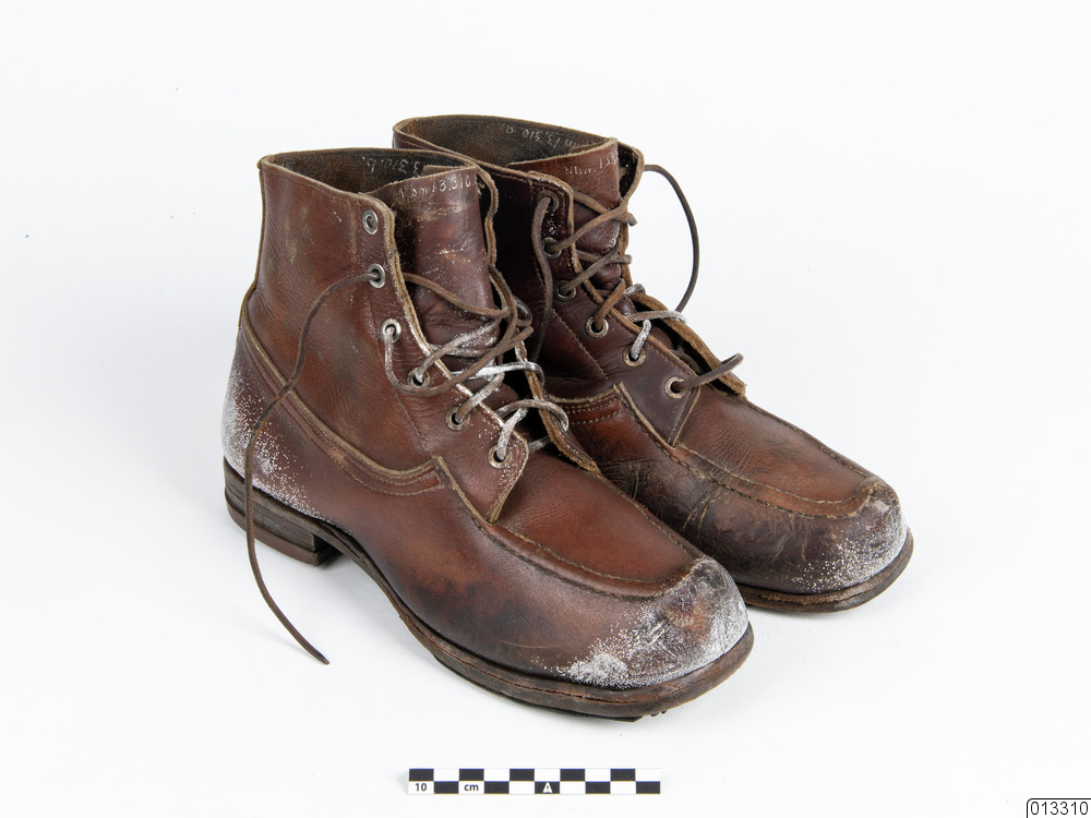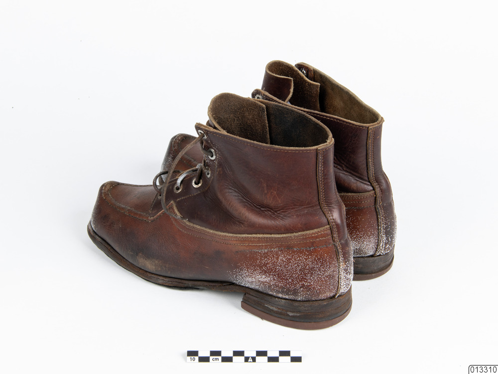 Pjäxa. Ett par bruna läderpjäxor med fast plös och sex par remhål med läderremmar för snörning. Gummisulor. Text på klacken i b "Elg klack, 20" samt ett älghuvud och åtta rundlar, allt i relief.