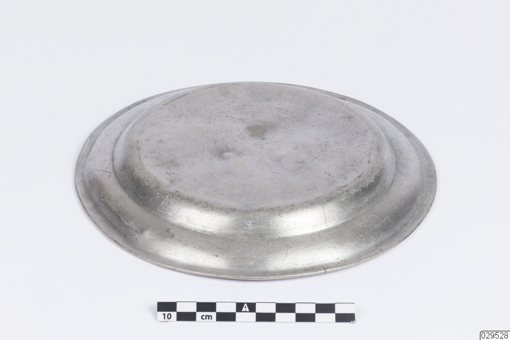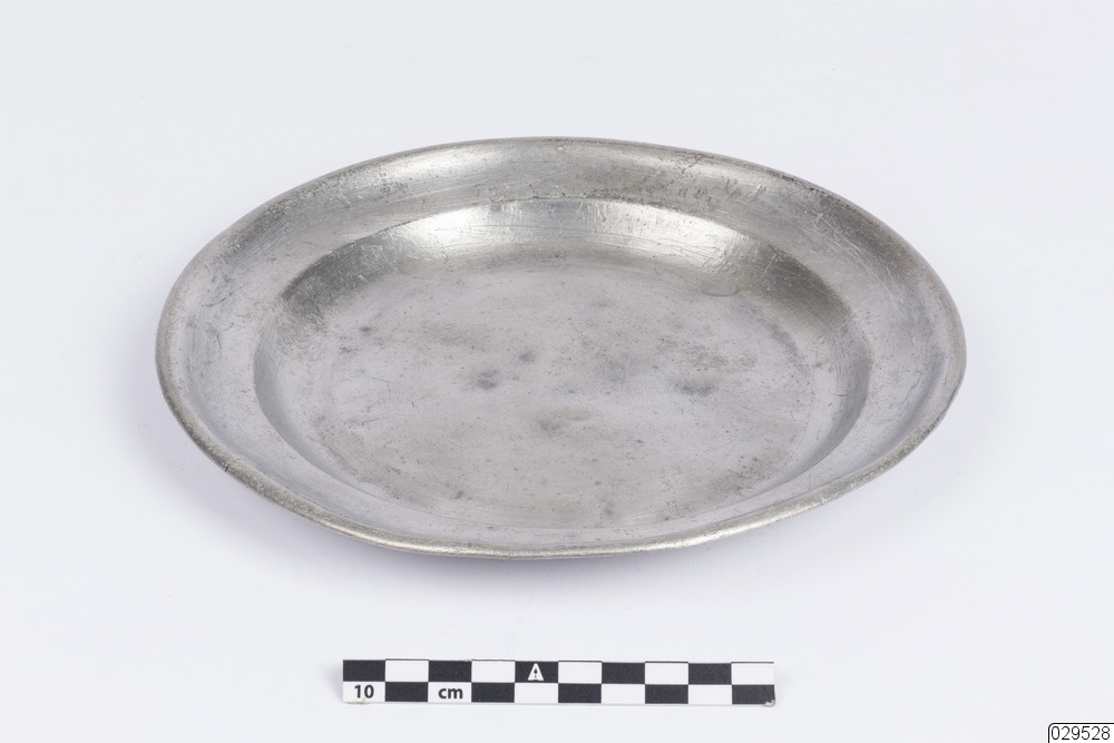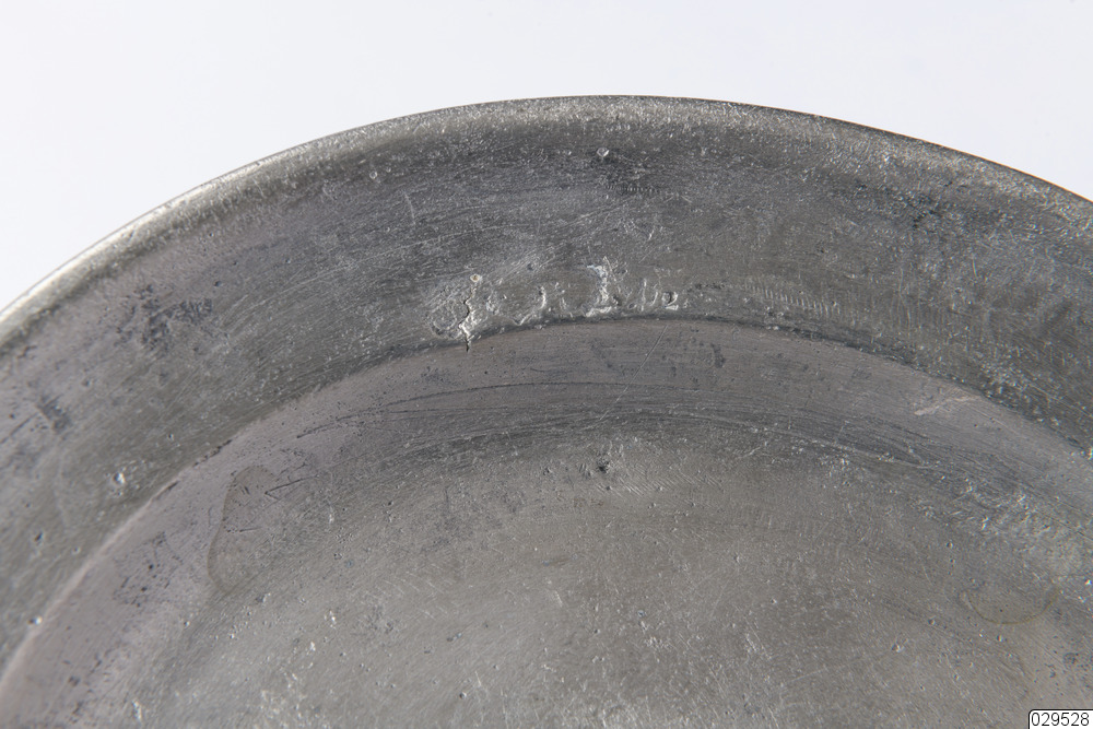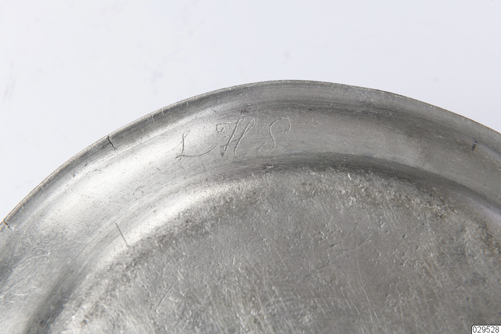 - Tennfat. På undersidan finns några inristade initialer, LHS, samt några bomärken. På fatets brätte finns några stämplar; en årstämpel, eventuelltl "L2", vilket ger tillverkningsåret 1793, samt några oläsliga stämplar.