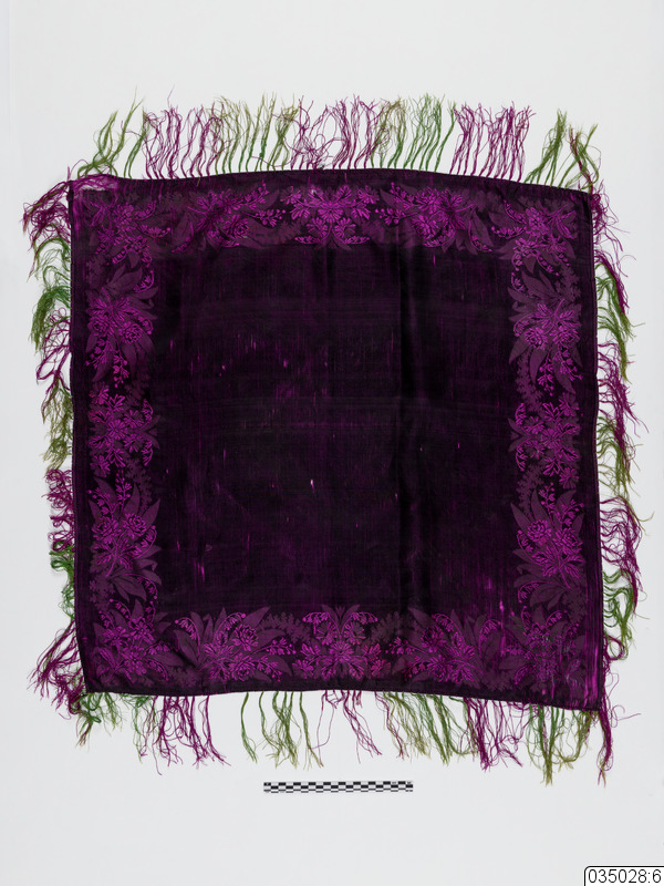 Sidensjal i olika lila nyanser, med frans i grönt och lila. Bred kantbård med blommor.