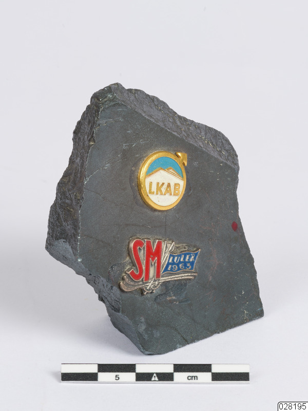 Järnmalm med två fastlimmade metallmärken. En med LKAB- logotyp och en med SM- Luleå 1963.