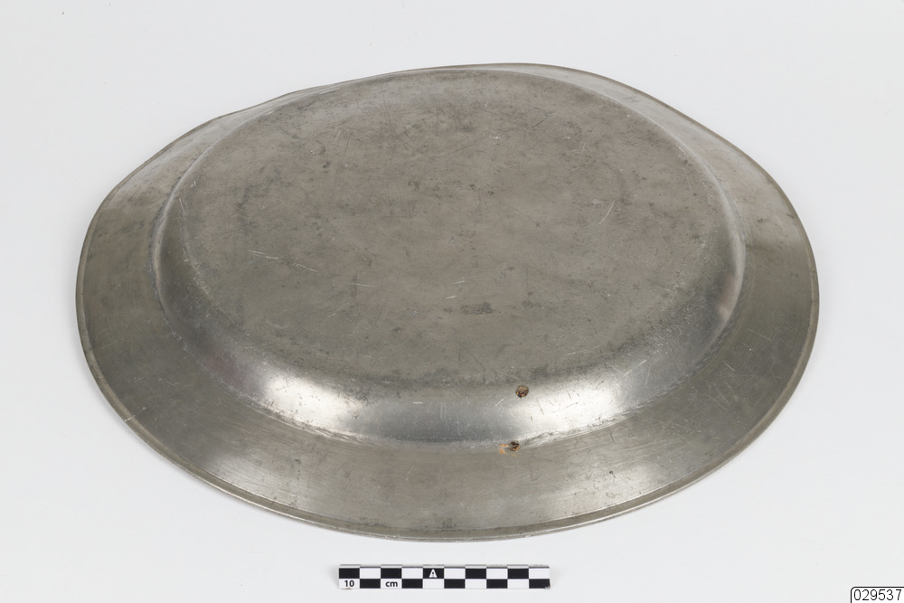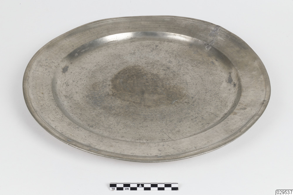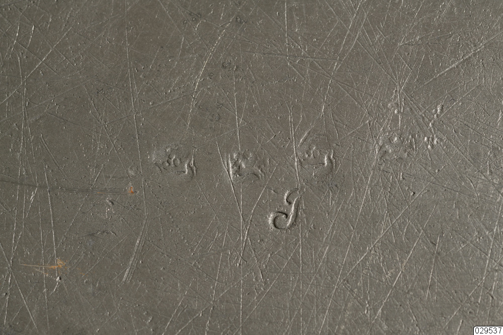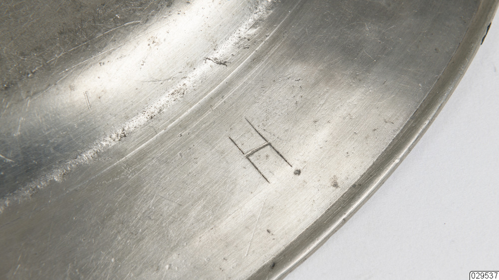 Tennfat med stämplar på undersidan. Två kronstämplar samt ytterligare tre otydliga stämplar. Inristade initialer eller bomärken.