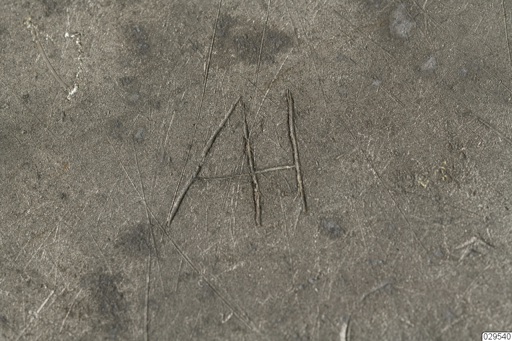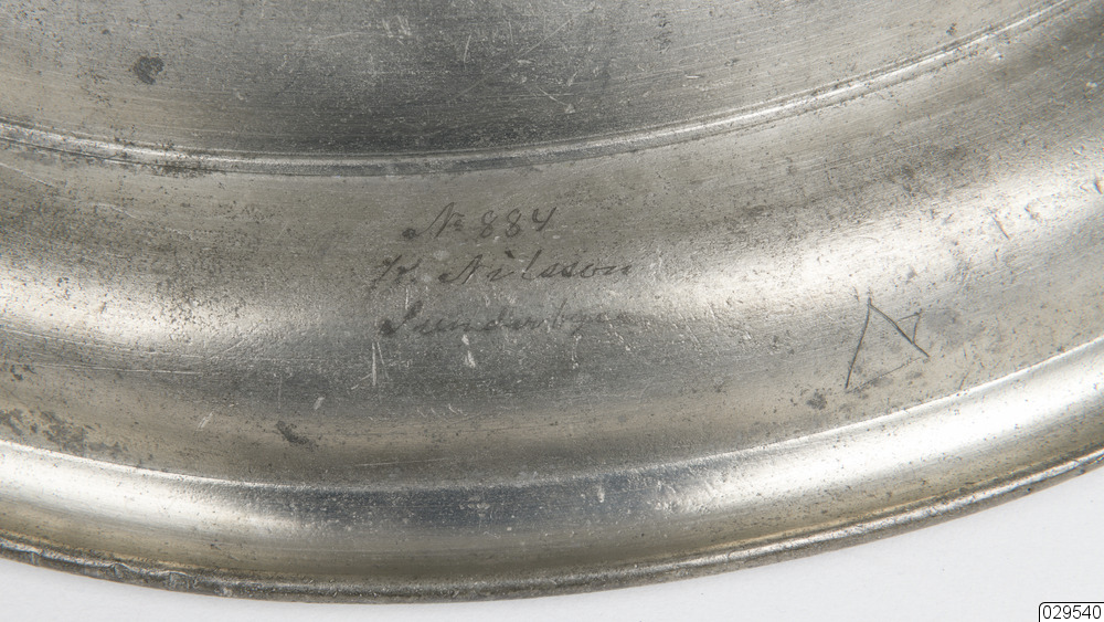 Tennfat utan synliga stämplar. Inristade initialer eller bomärken. Text på undersidan: Nr 884 K Nilsson Sunderbyn.