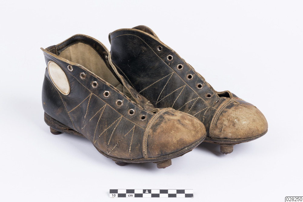 Ett par fotbollsskor med 6 dobbar per sko. De är svarta med en vit cirkelformad dekoration fastsydd på yttersidan. Det finns fjorton öglor per sko men snören saknas. Det finns en innersula av plast.