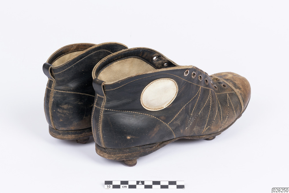 - Ett par fotbollsskor med 6 dobbar per sko. De är svarta med en vit cirkelformad dekoration fastsydd på yttersidan. Det finns fjorton öglor per sko men snören saknas. Det finns en innersula av plast.