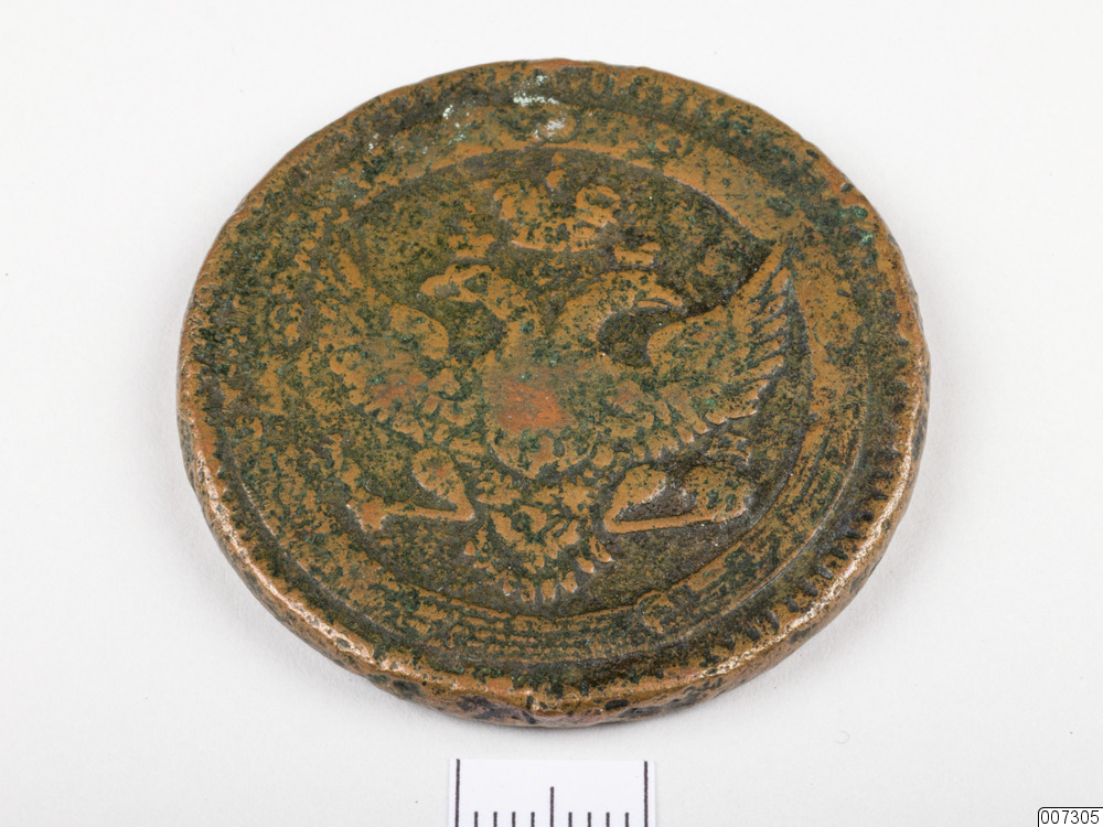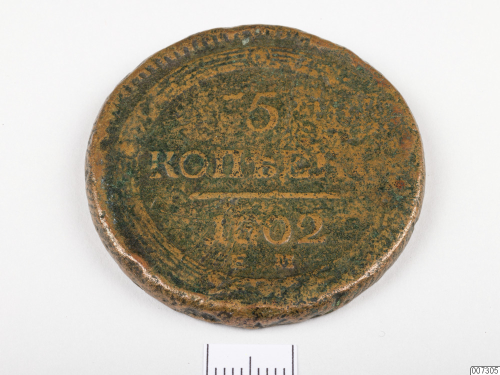 Mynt av koppar.På myntets ena sida en dubbeörn, och på den andra texten 5 kopek 1802.