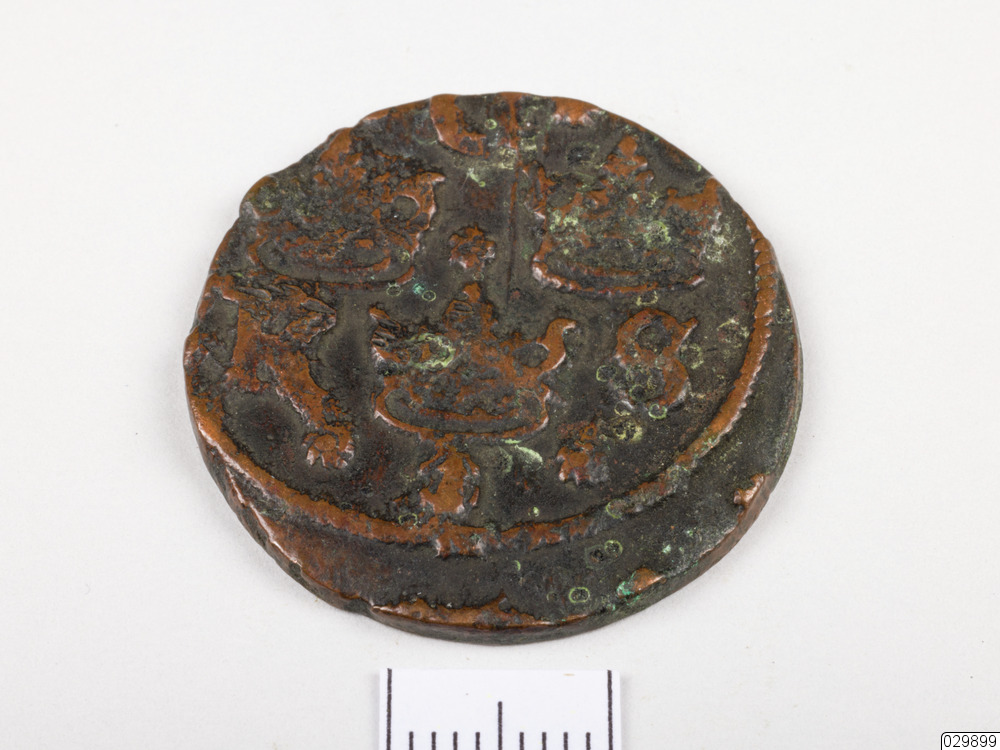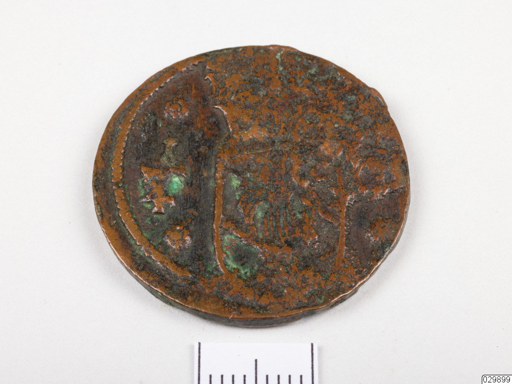 Ett kopparmynt med oläsligt årtal.