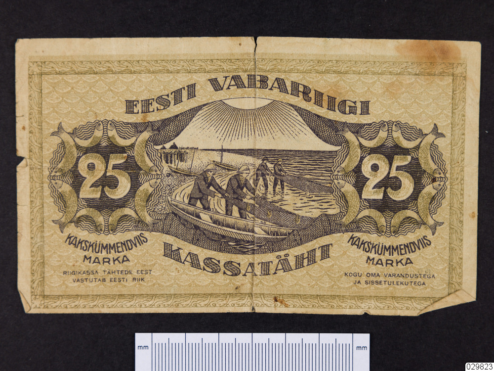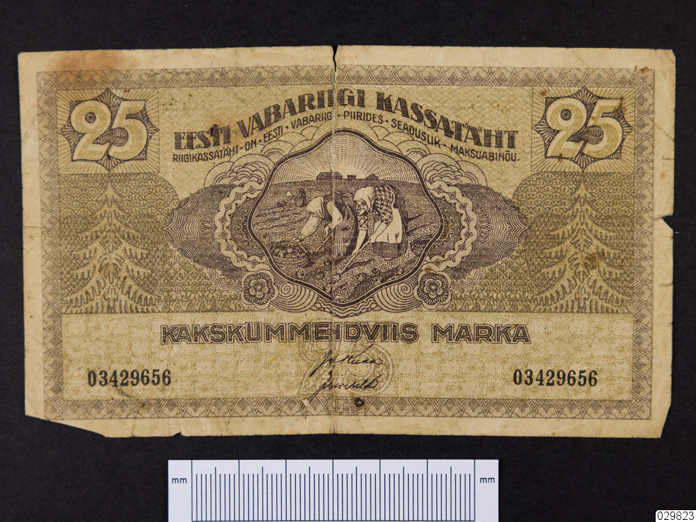 En estnisk sedel om 25 mark. Skänkta av Albin Sandström, Lulavan, som fått dessa två sedlar (Nbm 29824-25) efter sin morbror, faktor Nils Johan Andersson från Bälinge, som fått dem på en resa till Estland.
