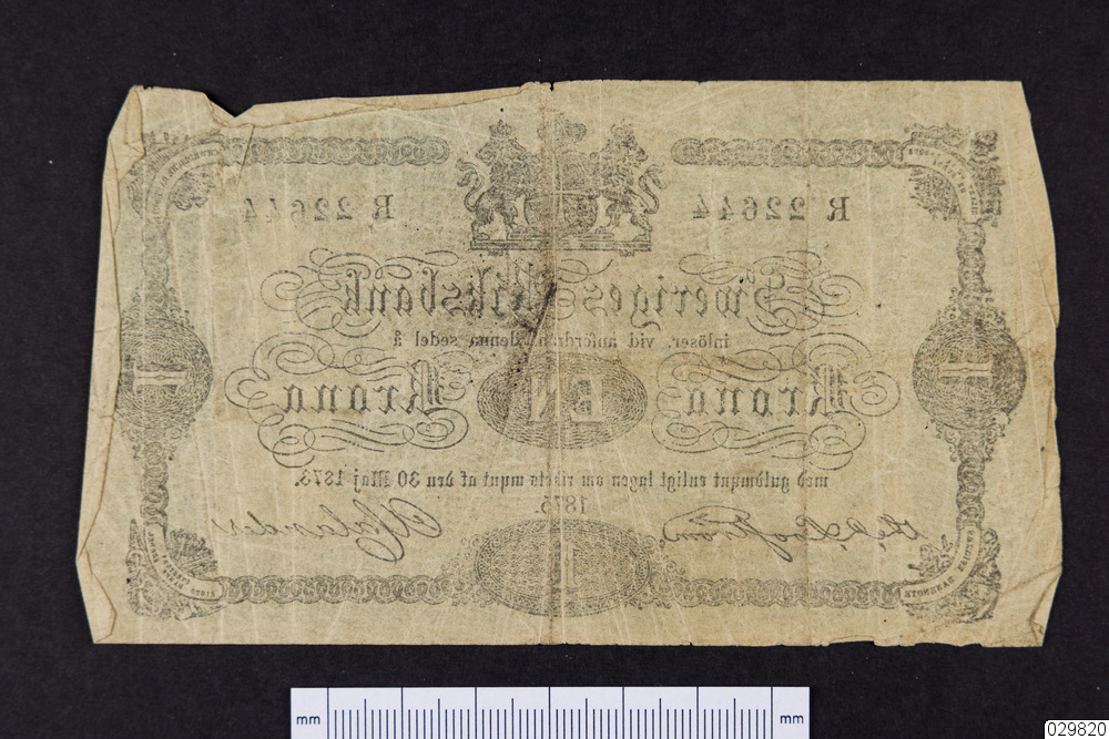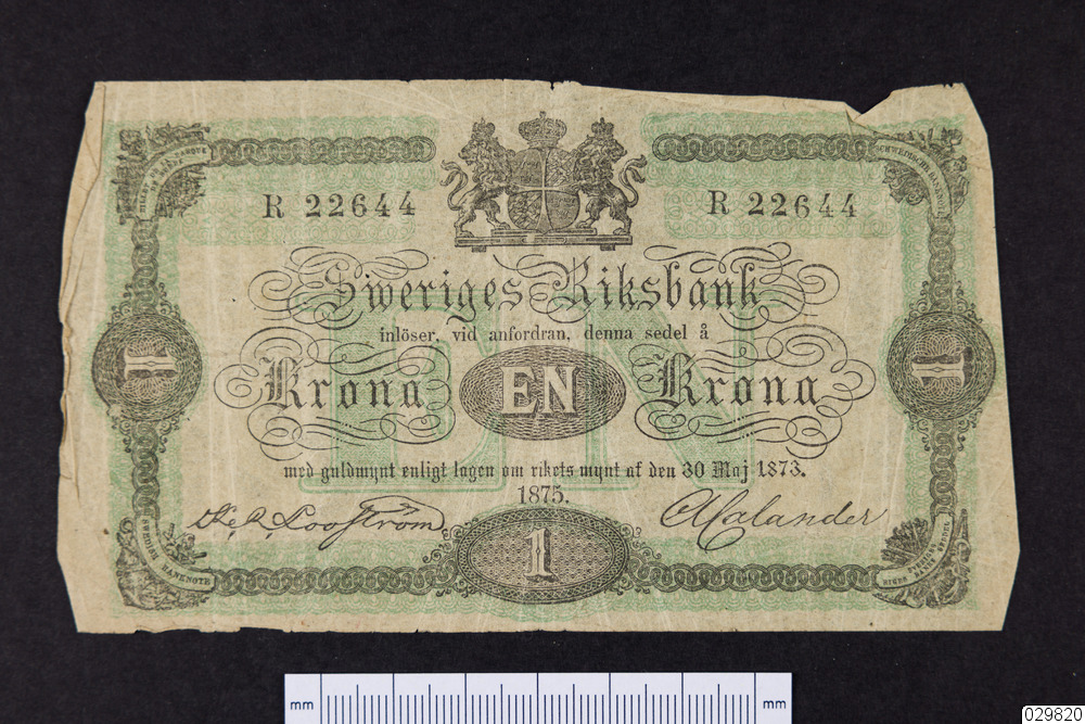 R 22644 Sweriges Riksbank inlöser vid anfordran, denna sedel å en Krona med guldmynt...