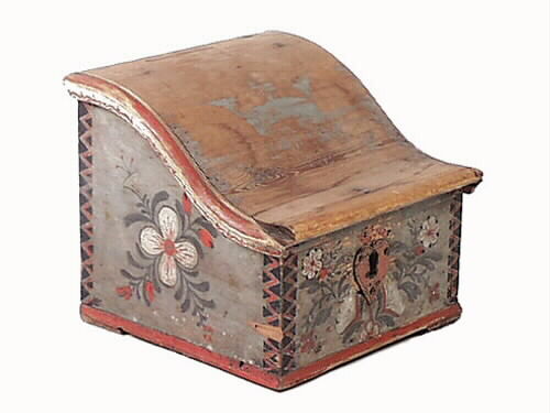 - Skrin. Snedklaffskrin i furu med svängt lock samt lås. Skrinet är blåmålat med blommålning i rött, vitt med flera färger samt röda lister. På lockets insida finns målat: ÅR "1776-AMS-Dato April (---?)".