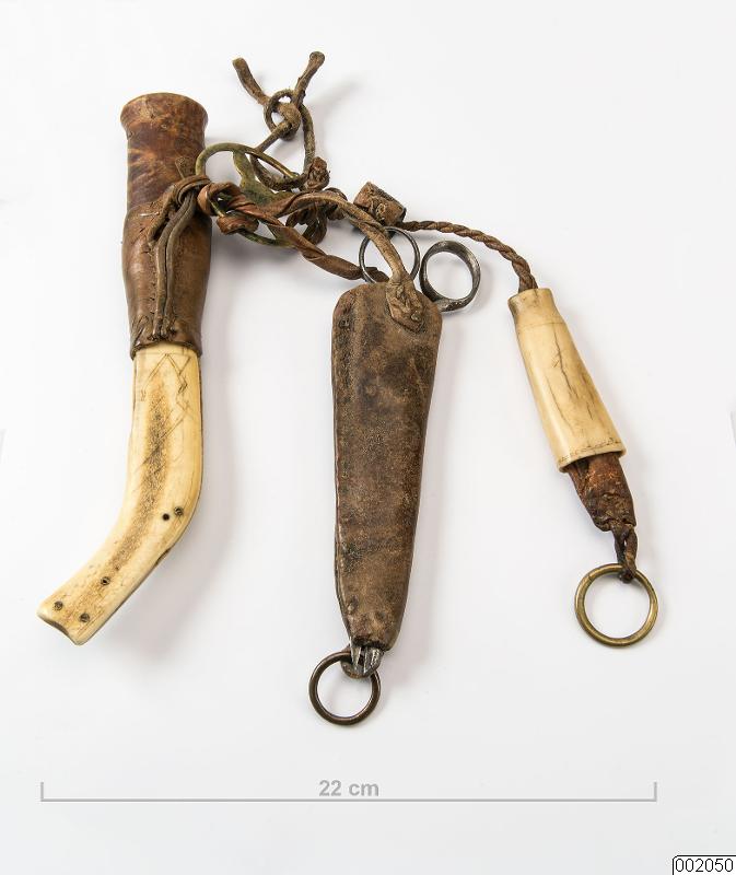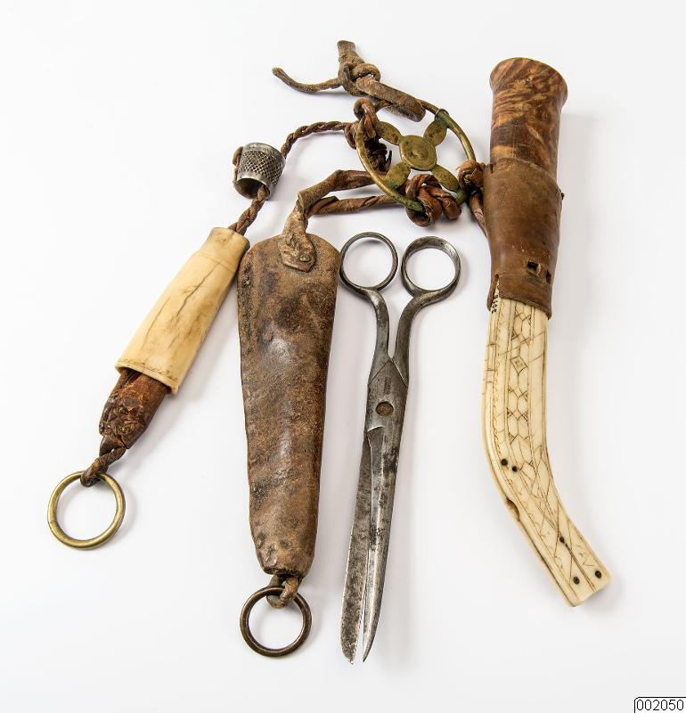 Sytillbehör. Bältesgehäng med kniv, sax, nålhus och syring. Antal delar: 5 st.