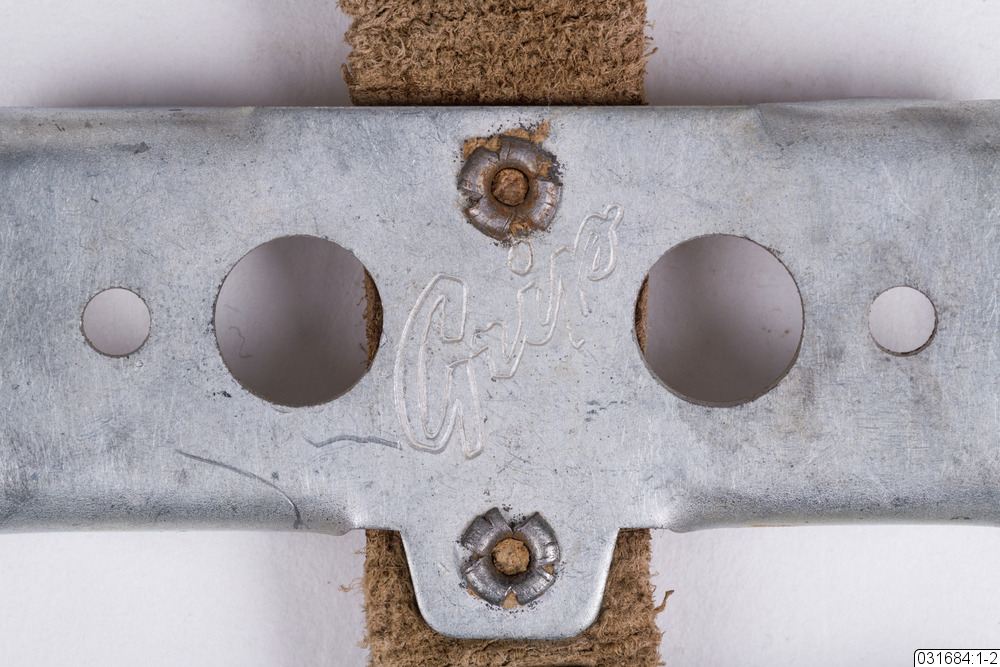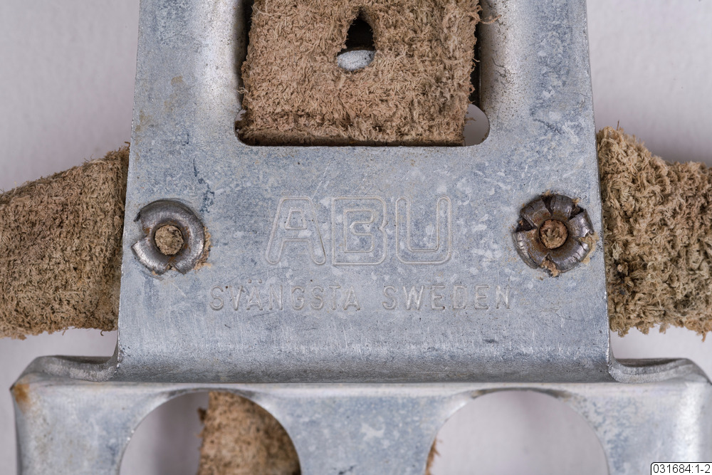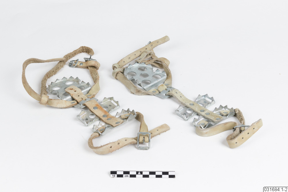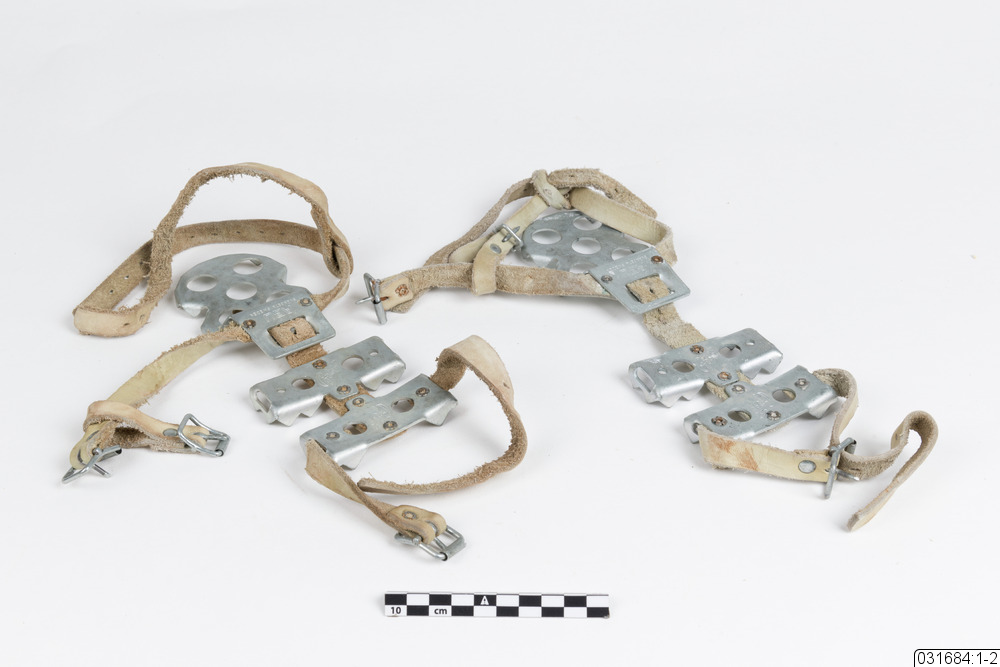 Ett par broddar av metall för hela skosulan, med bindning av läder. Längden kan justeras utifrån skostorlek.