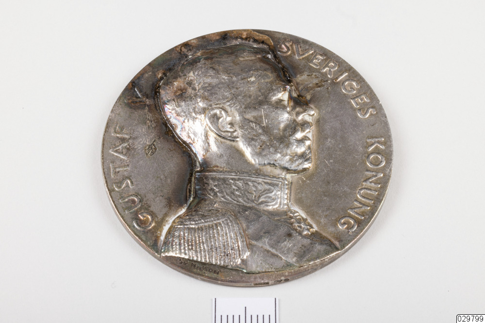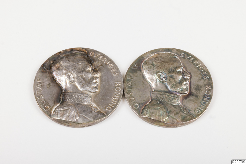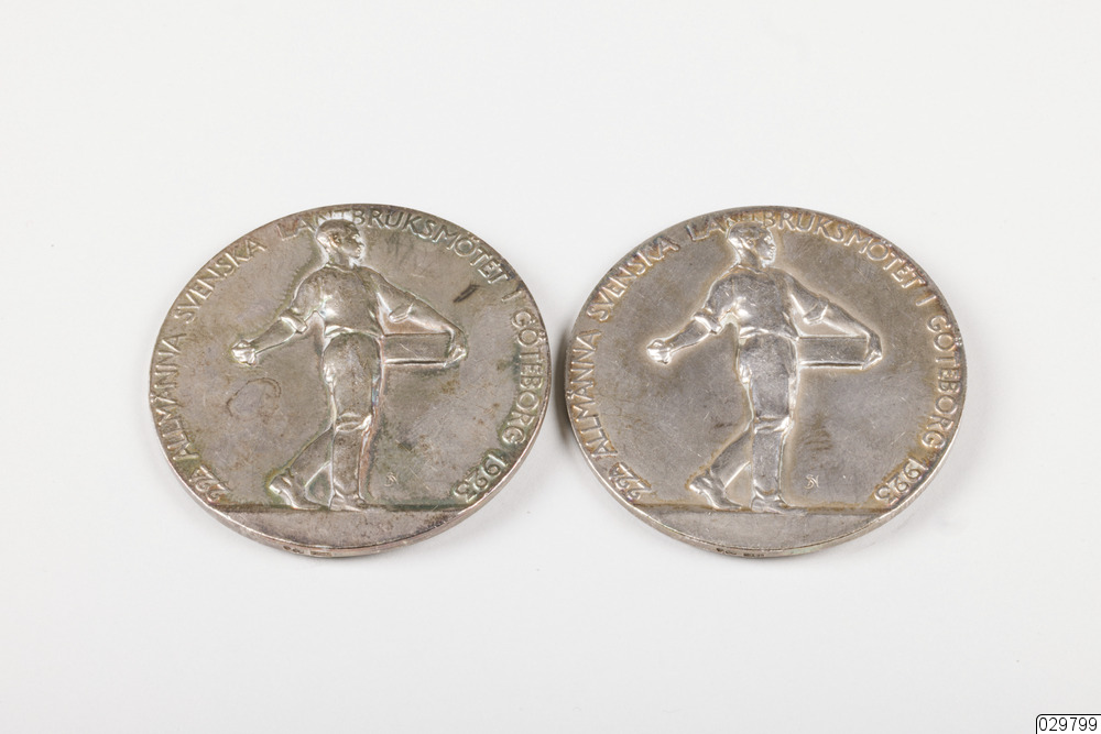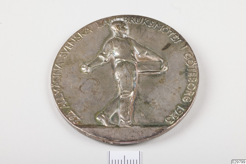 Medalj i brons. Kungens porträtt på den ena sidan och en såningsman på den andra.